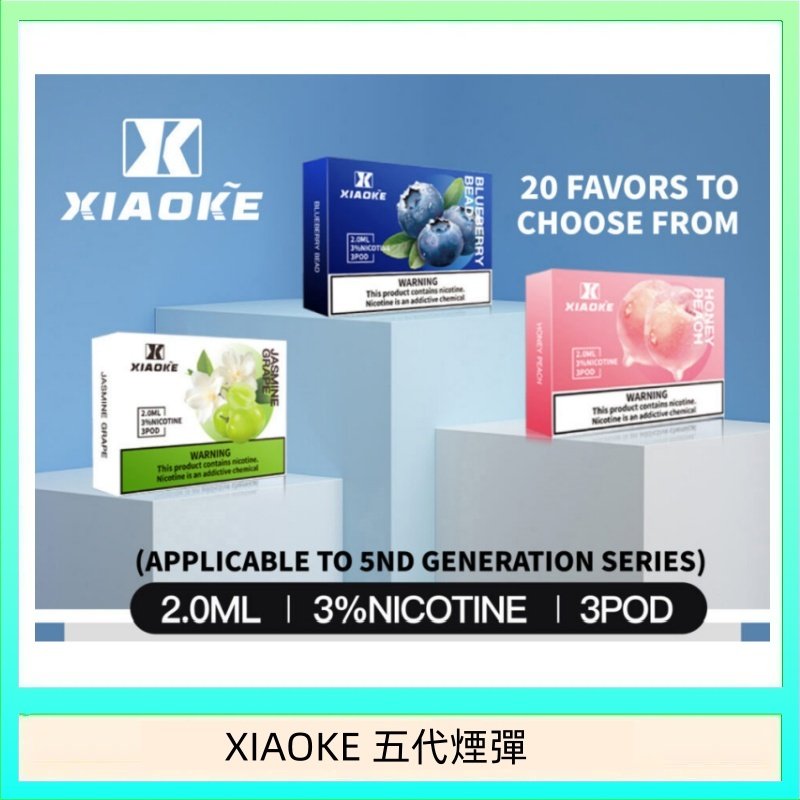 XIAOKE 梟客五代煙彈兼容市面多款五代與六代主機,包括 RELX 6代、MEHA 五代、ILIA 五代等。採用陶瓷霧化芯與全密封防漏設計,內含 2mL 大容量煙油、尼古丁濃度 3%,提供多達 15 種口味選擇。買 5 盒即送原版主機,超值優惠不可錯過!